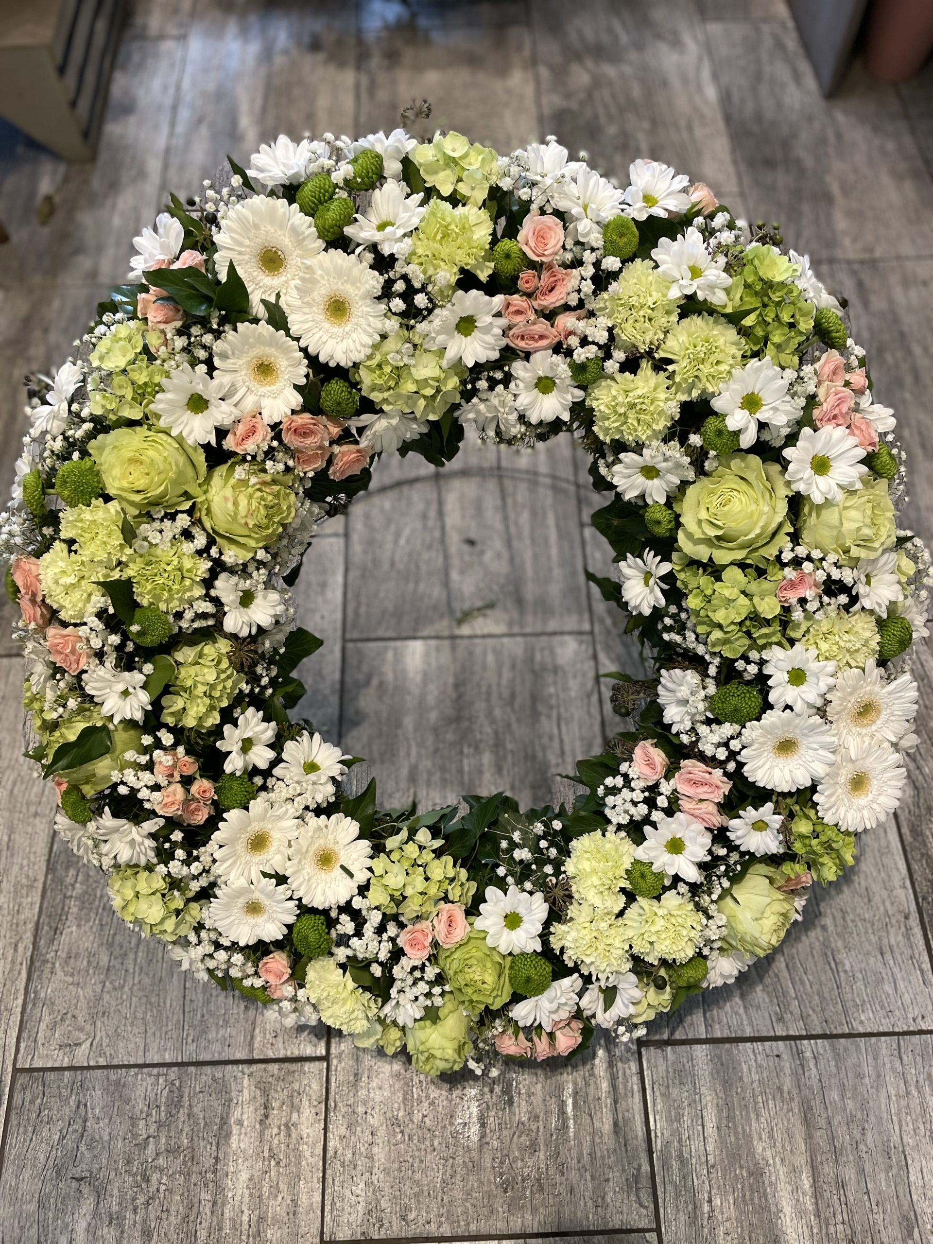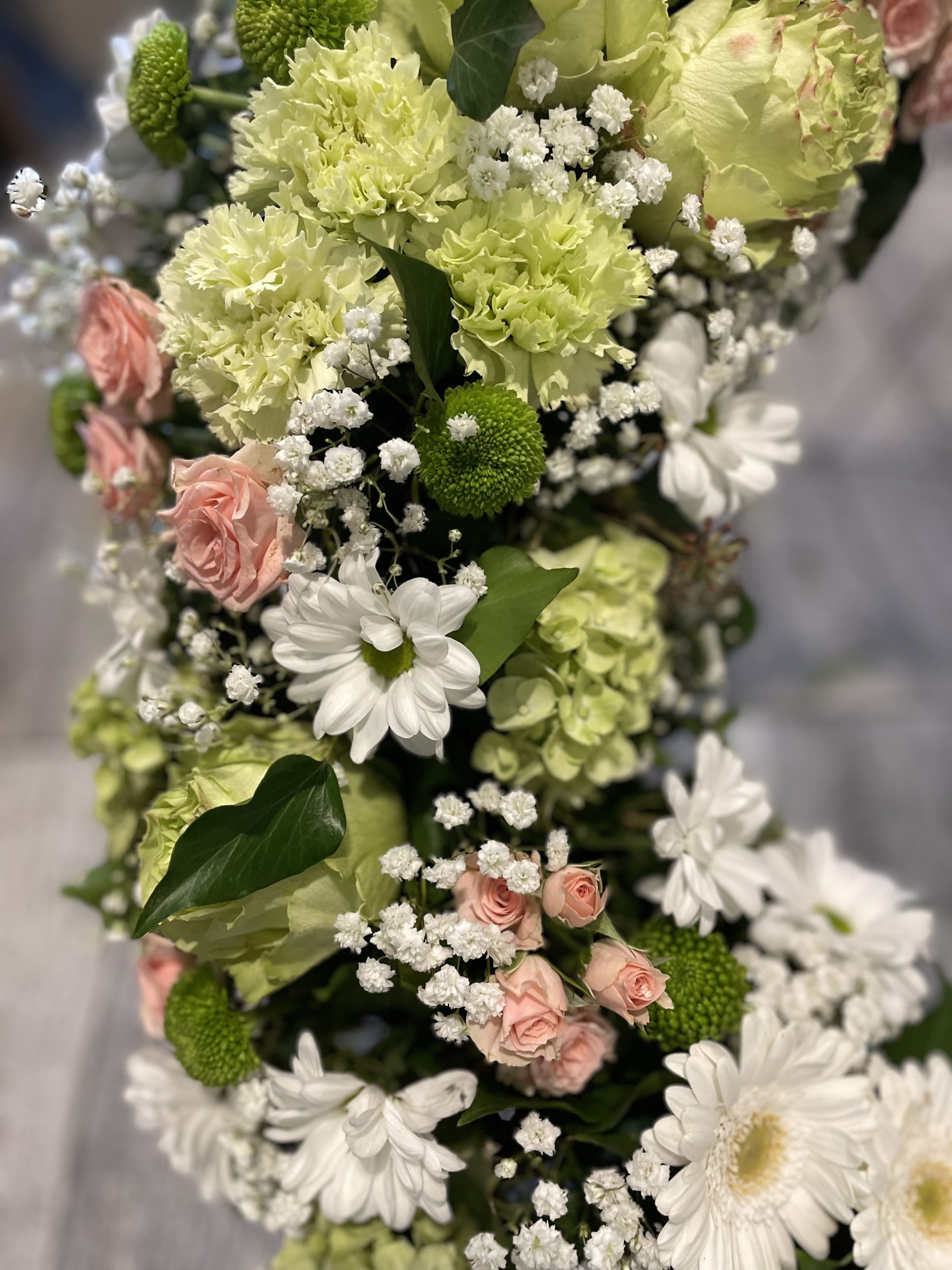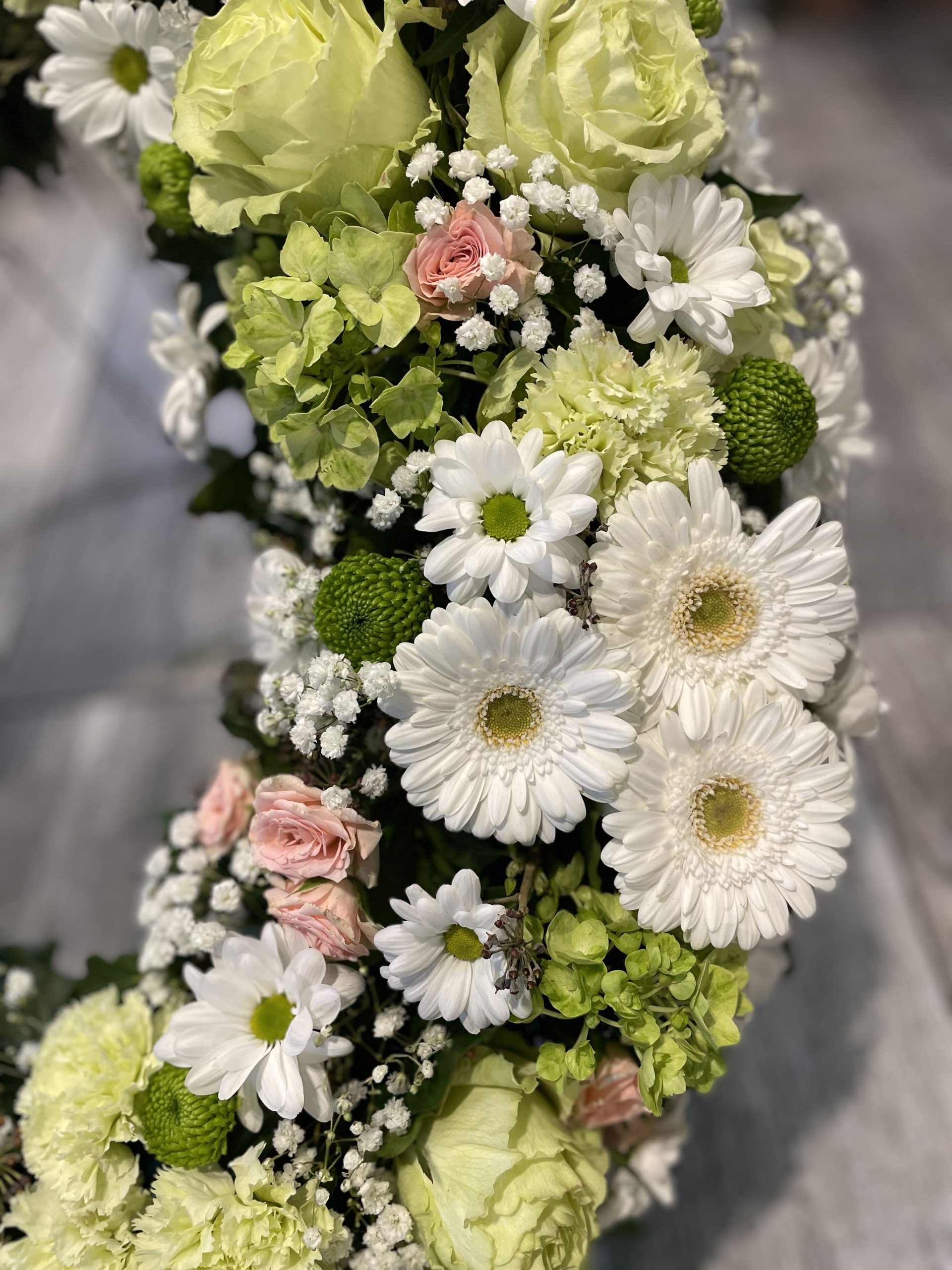 A Csendes Búcsú temetési koszorút azoknak készítjük, akik szeretnének szavak nélkül is tisztelettel és szeretettel megemlékezni. A fehér és zöld árnyalatok nyugalmat, békét és az örök emlékezést jelképezik.