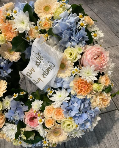 A koszorúhoz tartozó gyászszalag az ár részét képezi, amelyre rövid, személyes búcsúzó üzenetet írunk. Fontos, hogy a felirat ne legyen túl hosszú, mert a szalagra csak tömör szövegek férnek el esztétikusan. A búcsúzó személyek neveinek felsorolásakor is érdemes rövidebb formát választani.
