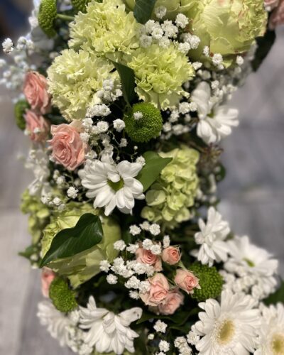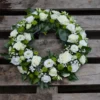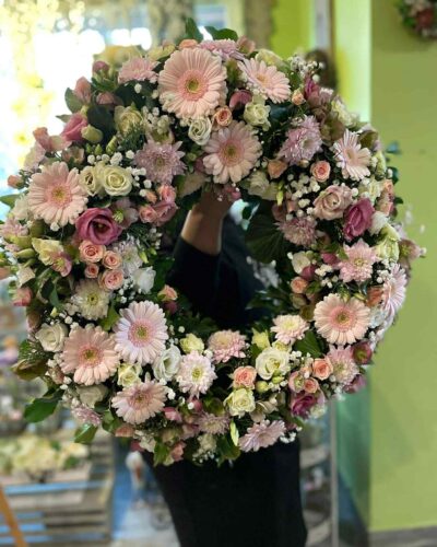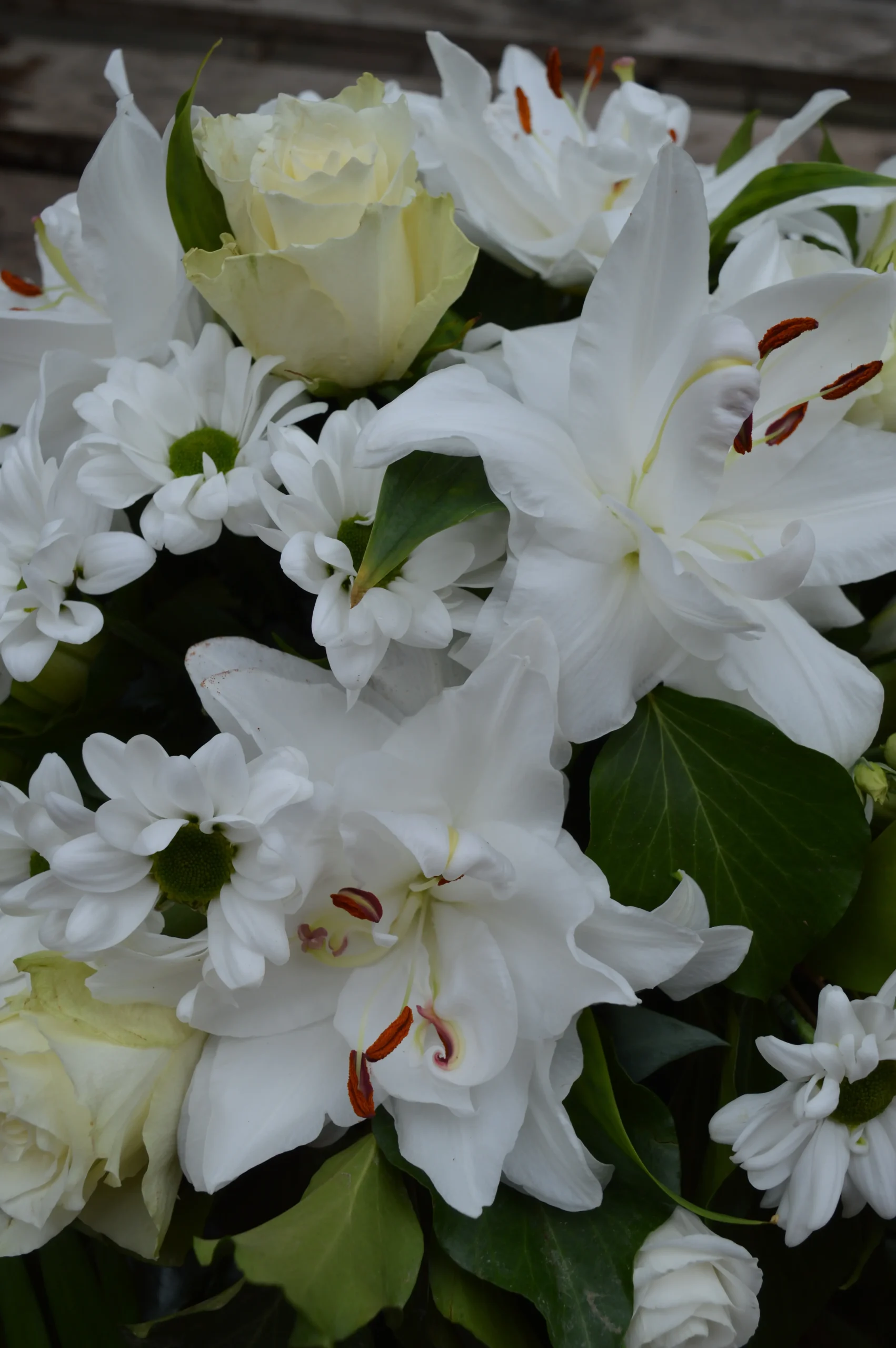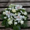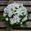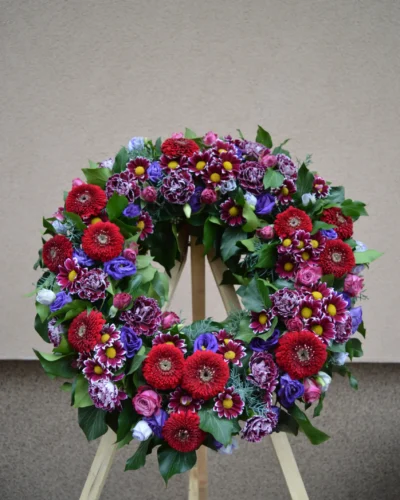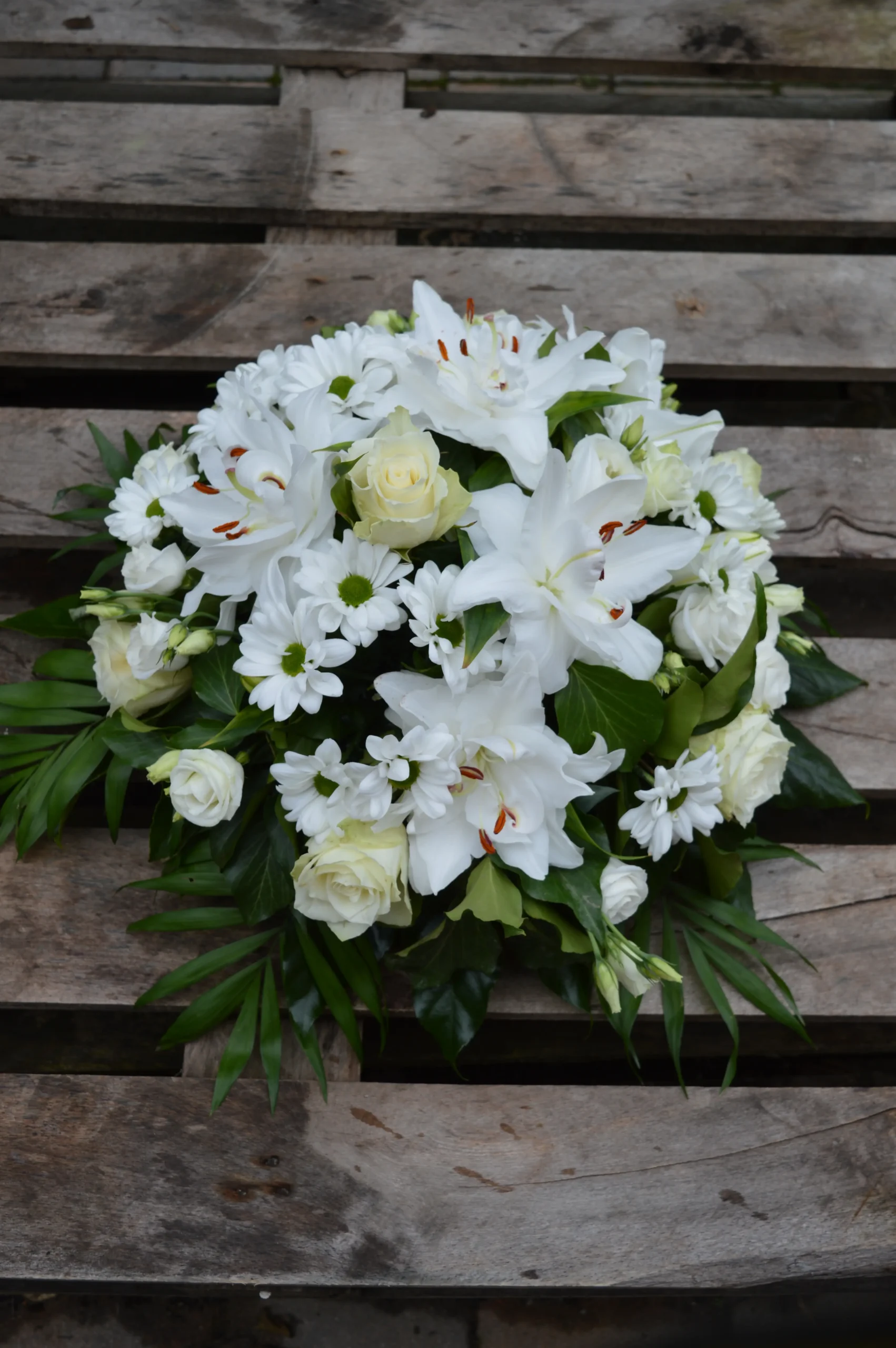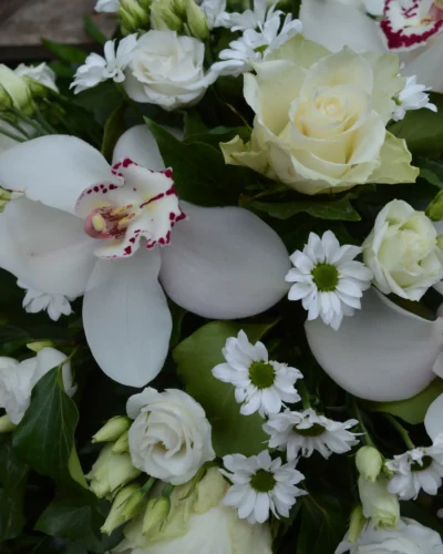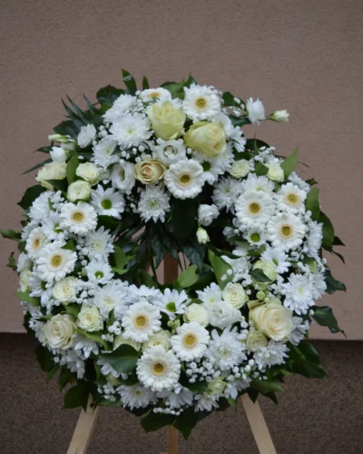 A Fehér dombkoszorú király liliommal a tisztaság, a hit és a felemelkedett emlékezés jelképe. A királyliliom ünnepélyes megjelenése méltóságot és emelkedettséget sugároz, míg a fehér árnyalatok a békét és a lelki nyugalmat szimbolizálják. A tömör forma stabil, harmonikus megjelenést biztosít a búcsú szertartásán, és méltó módon fejezi ki az örök szeretetet.