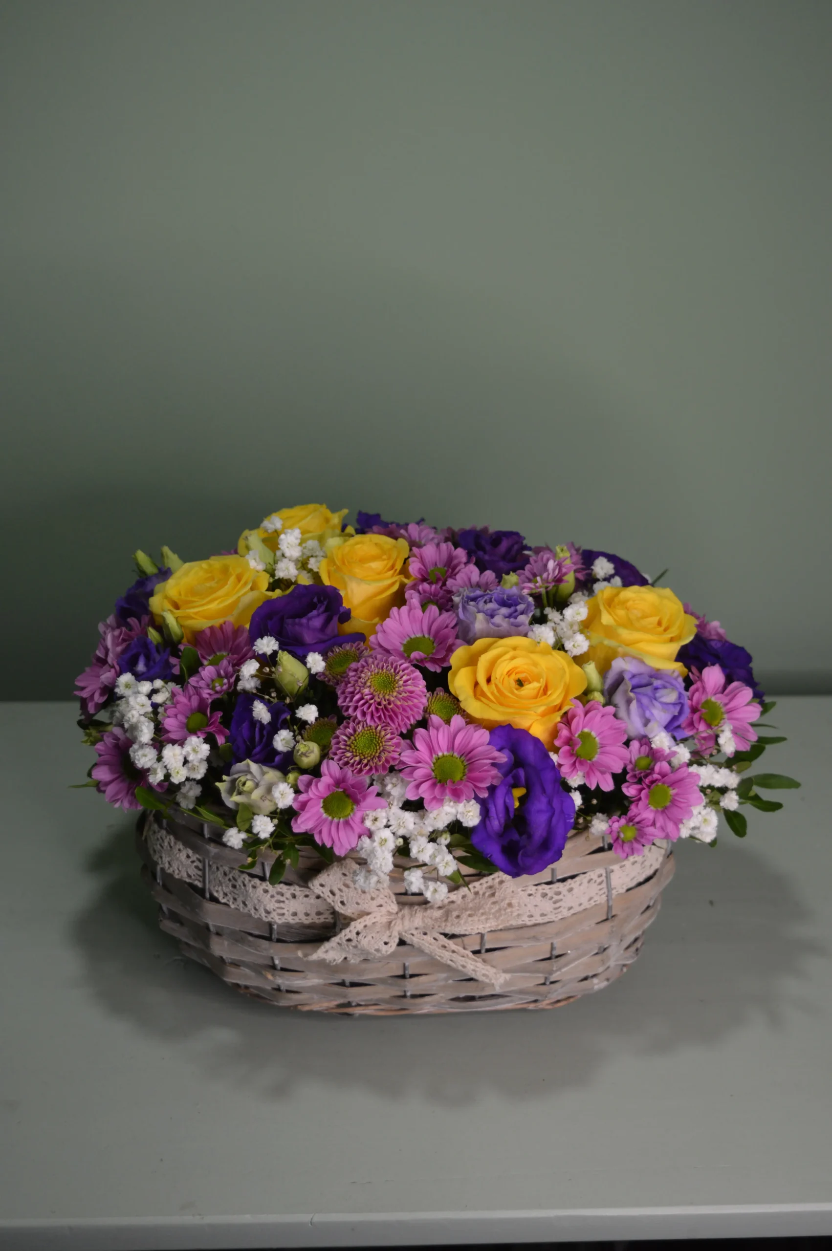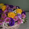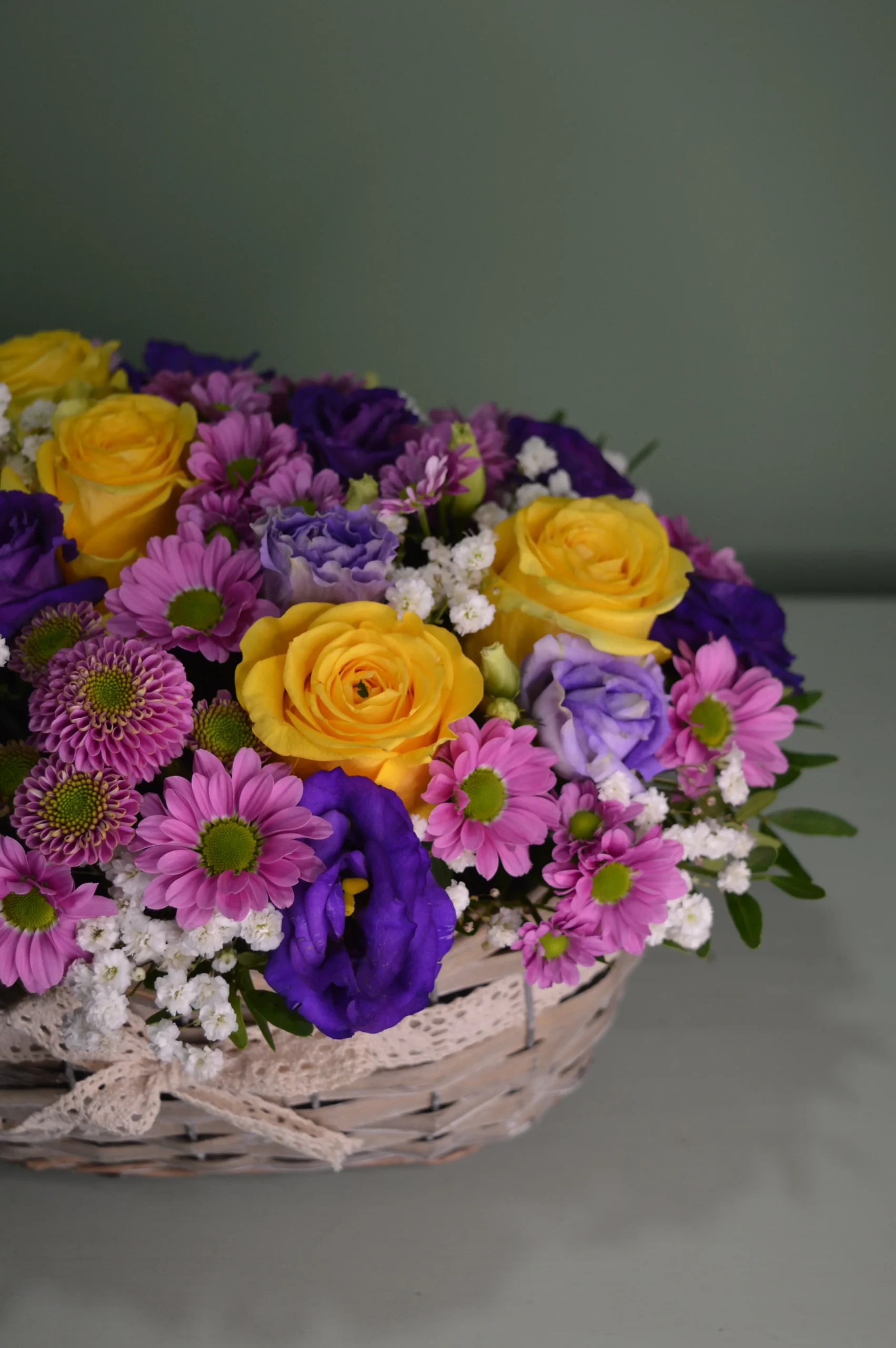 Színes, vidám virágkosár különleges alkalmakra és meglepetésekhez. Tökéletes választás, ha egy igazán látványos ajándékot keresel.