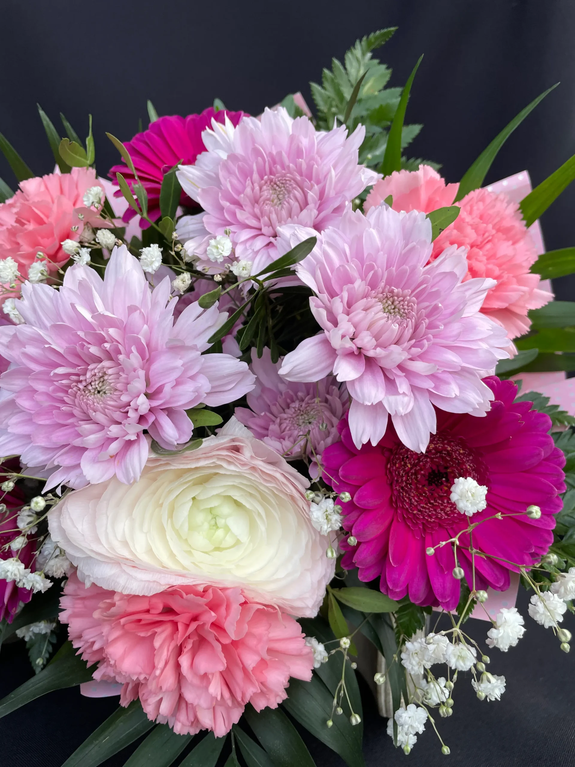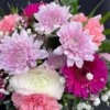 Friss, elegáns virágcsokor rózsaszín, lila és fehér árnyalatú virágokkal (rózsa, gerbera, krizantém, szegfű, rezgő és zöldek)