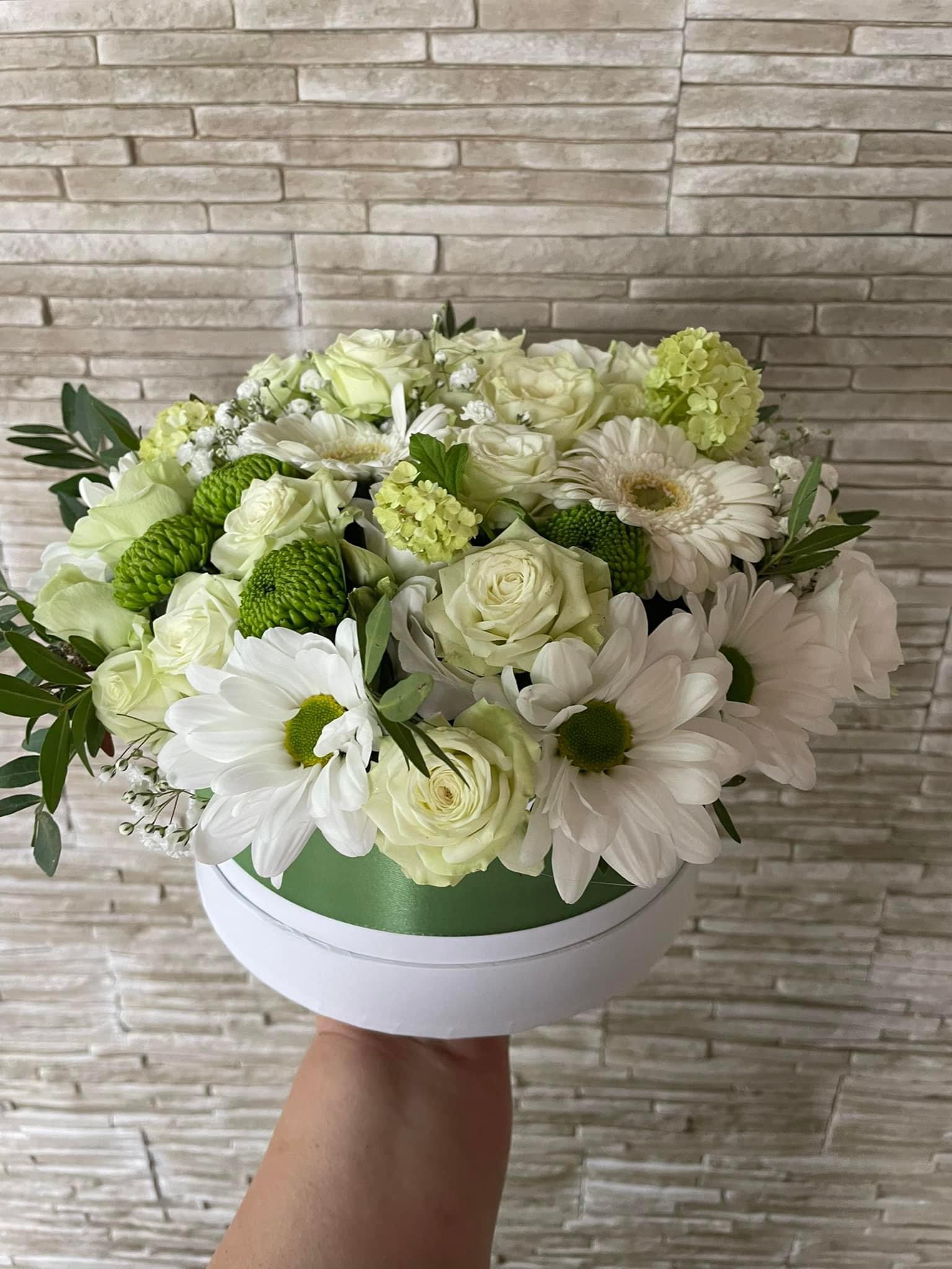 Zöld és fehér friss szezonális virágokból tűzött, mutatós virágalkotás, kiváló választás Anyák napjára, születésnapokhoz, névnapokhoz, ünnepekhez vagy ha csak feldobnád vele a napját.