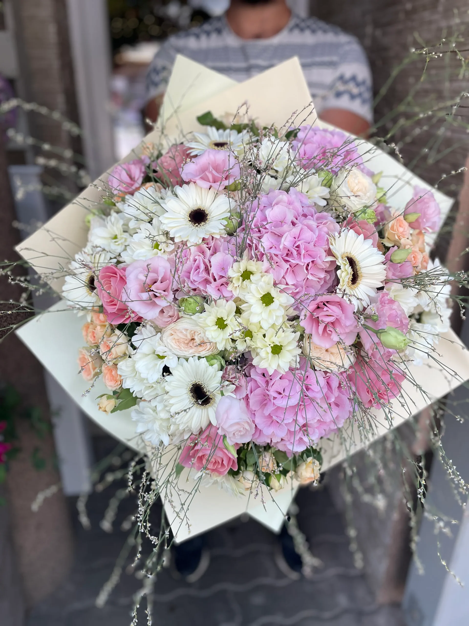 A Lágy rózsaszín mámor virágcsokor egy különleges, romantikus hangulatú alkotás, amely a lágy pasztell árnyalatok és friss virágok harmonikus összhangját idézi. A csokorban rózsák, hortenziák, germini és lisianthus virágok egyesülnek, hogy gyengéd, mégis impozáns megjelenést alkossanak.
