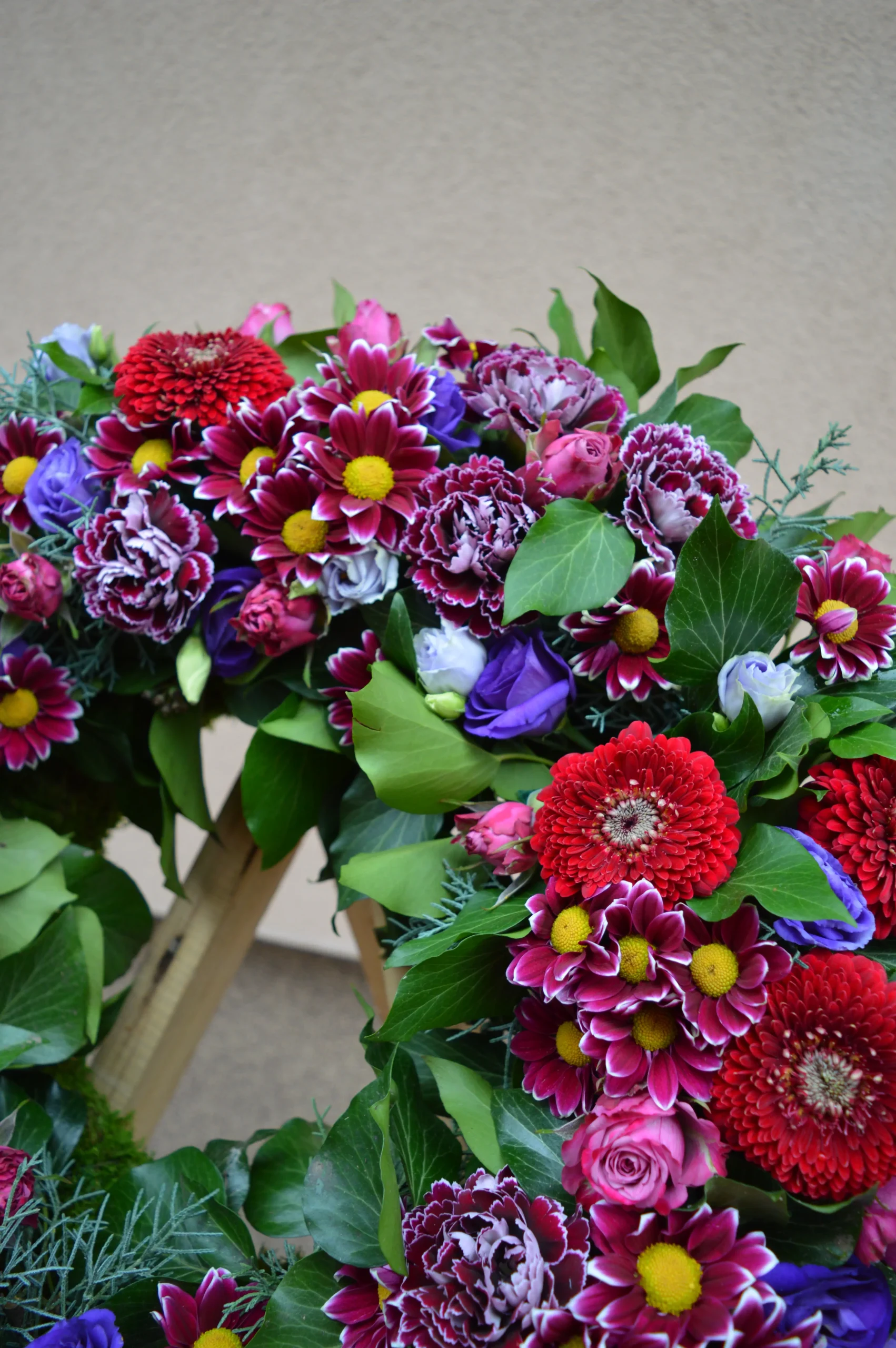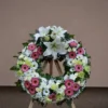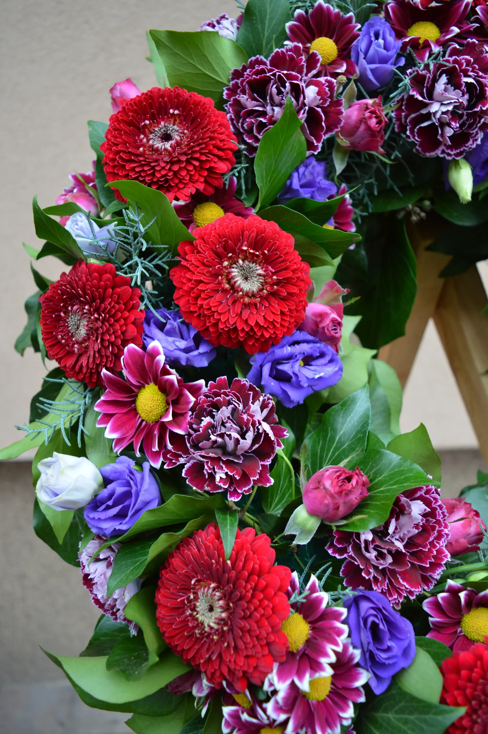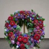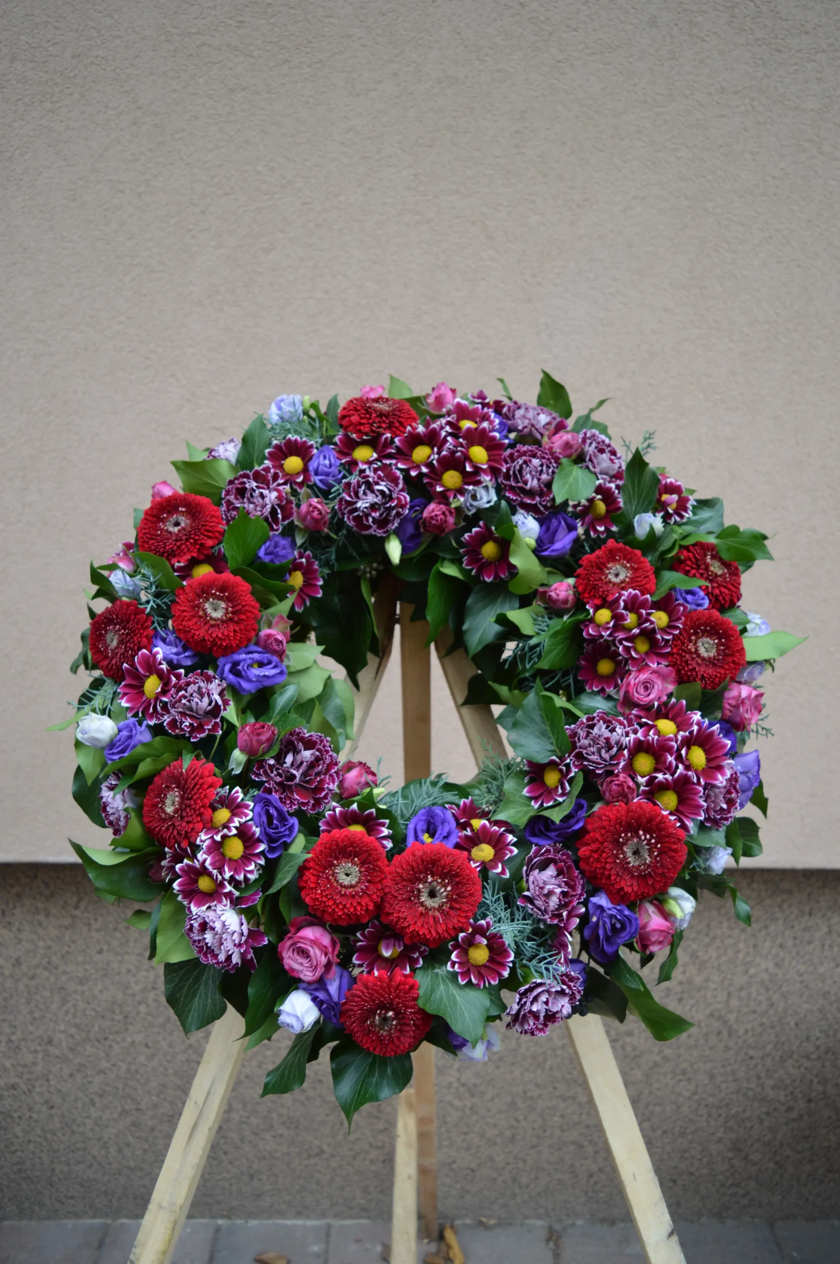 A Méltó Búcsú színes temetési koszorút azoknak készítjük, akik szeretettel, tisztelettel és mély érzelmekkel szeretnének megemlékezni. A bordó, lila és zöld árnyalatok az élet gazdagságát és az emlékek erejét hordozzák.