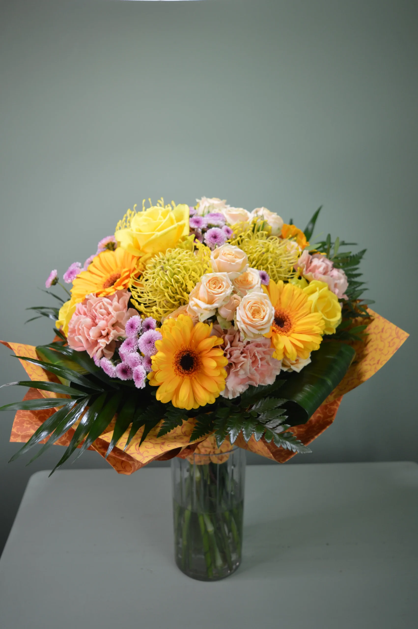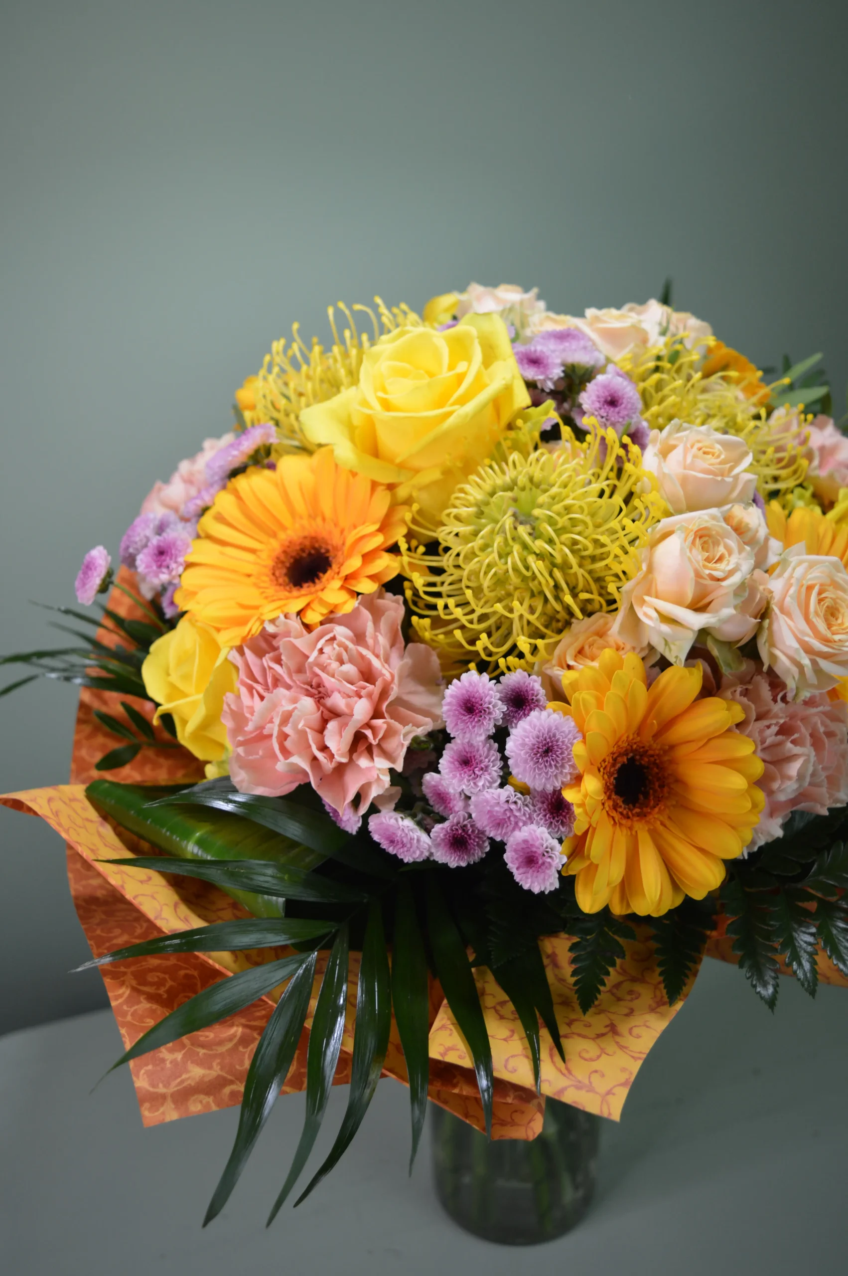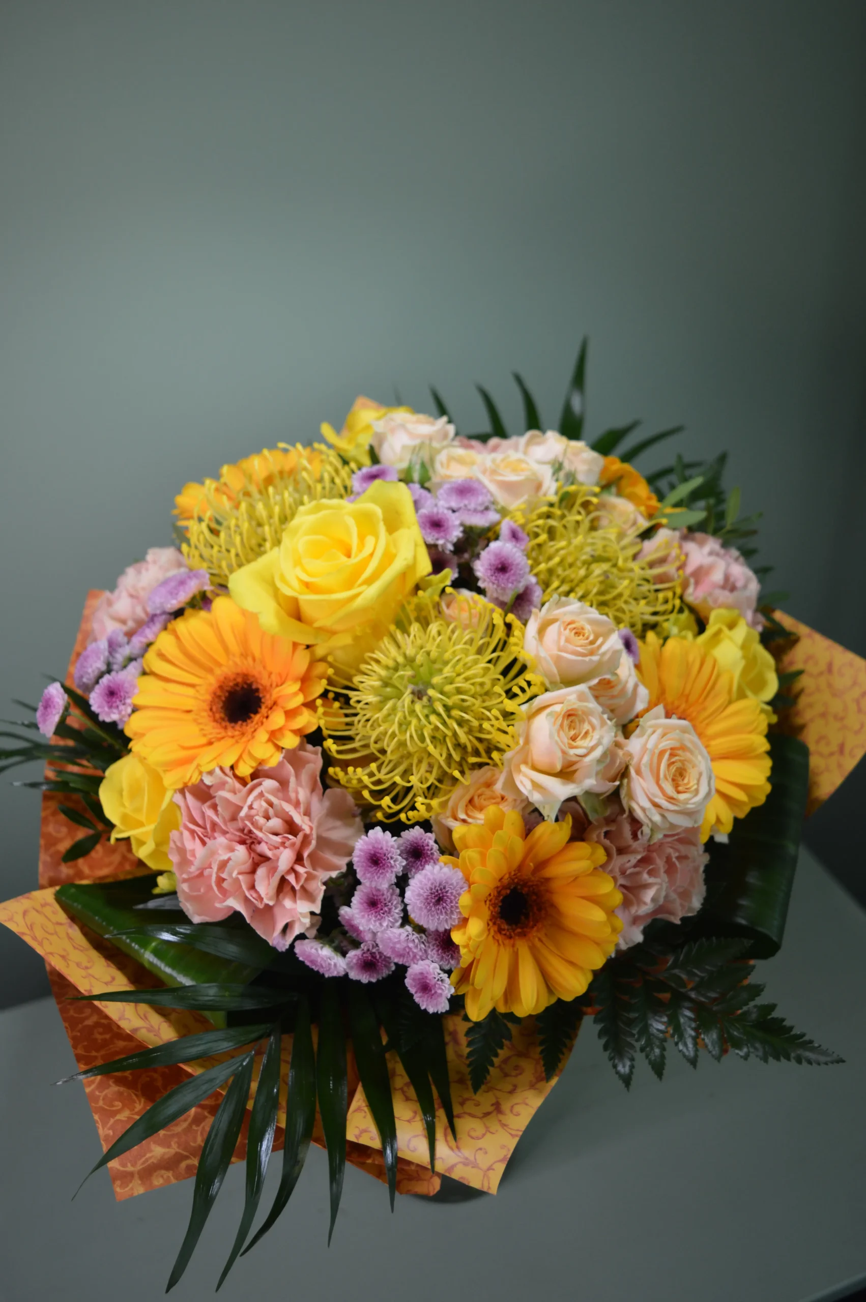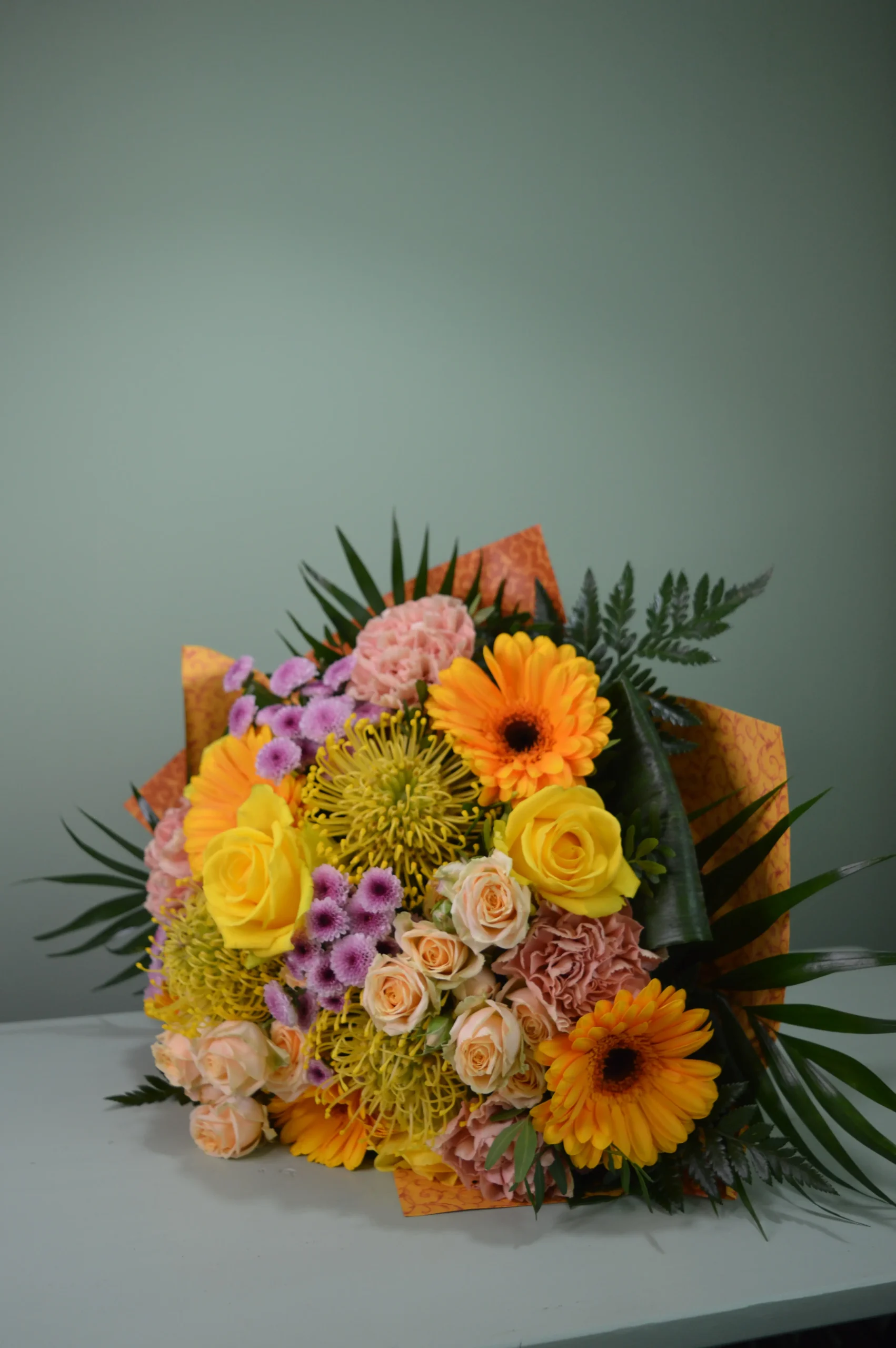 Ez a csokor tökéletes választás születésnapra, névnapra, köszöntéshez, vagy akár csak egy kedves meglepetésként is. Színvilága meleg, barátságos hangulatot áraszt, amely azonnal mosolyt csal az arcokra.