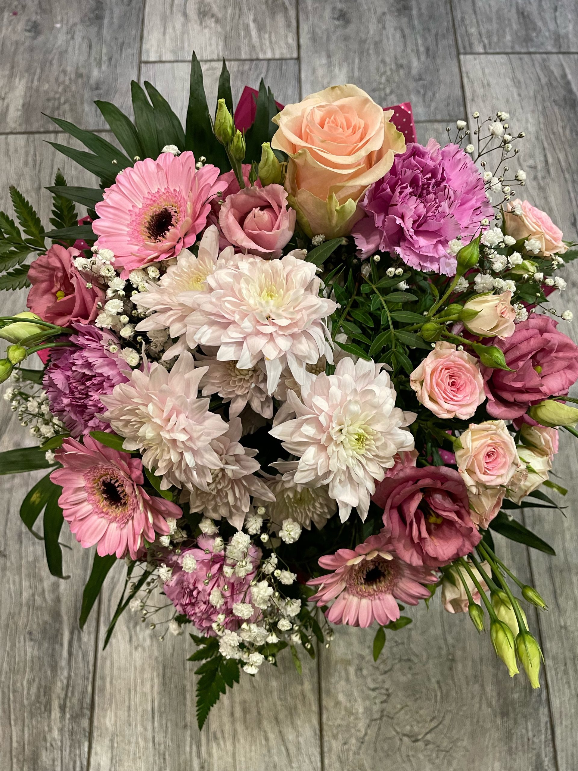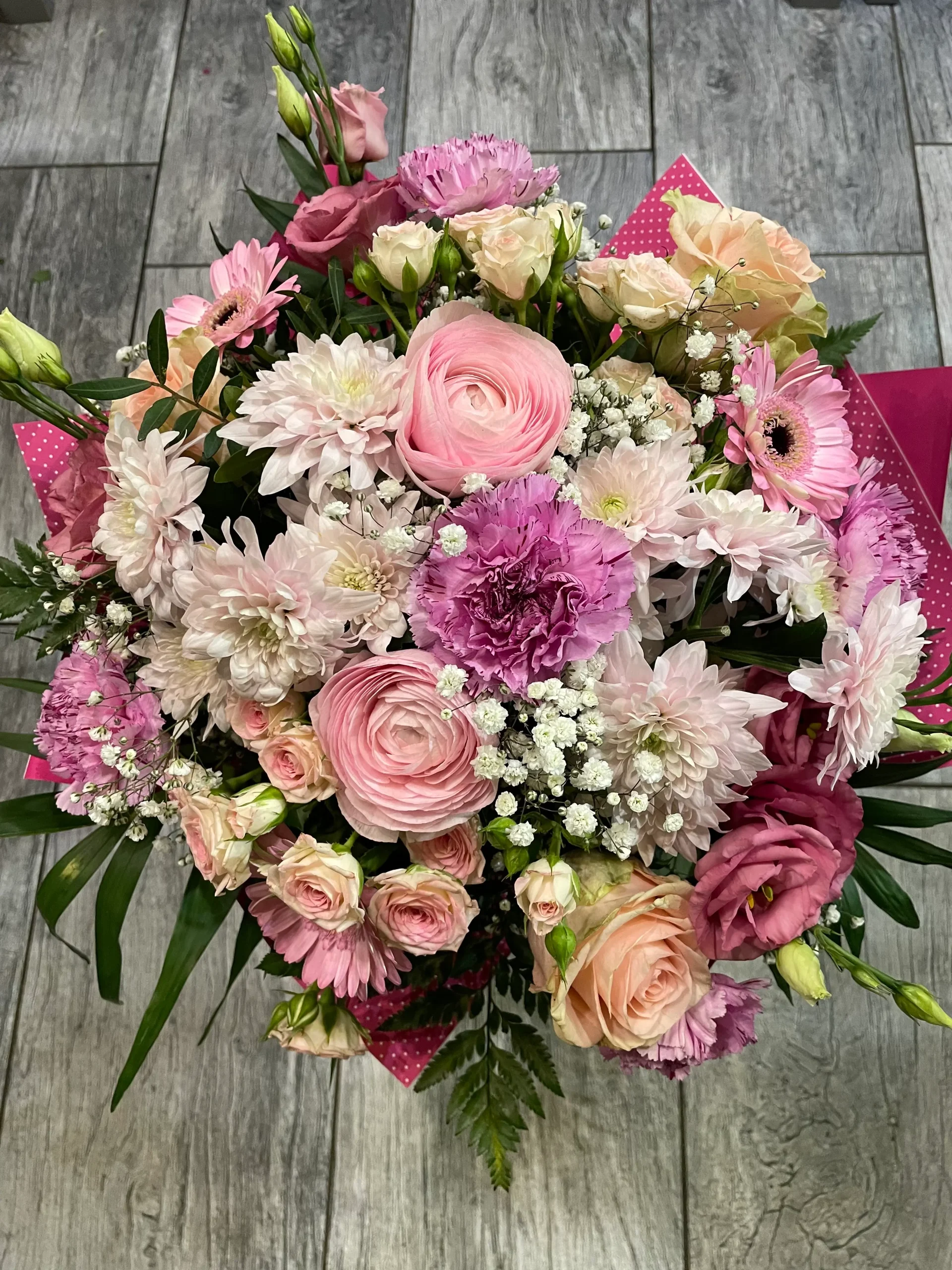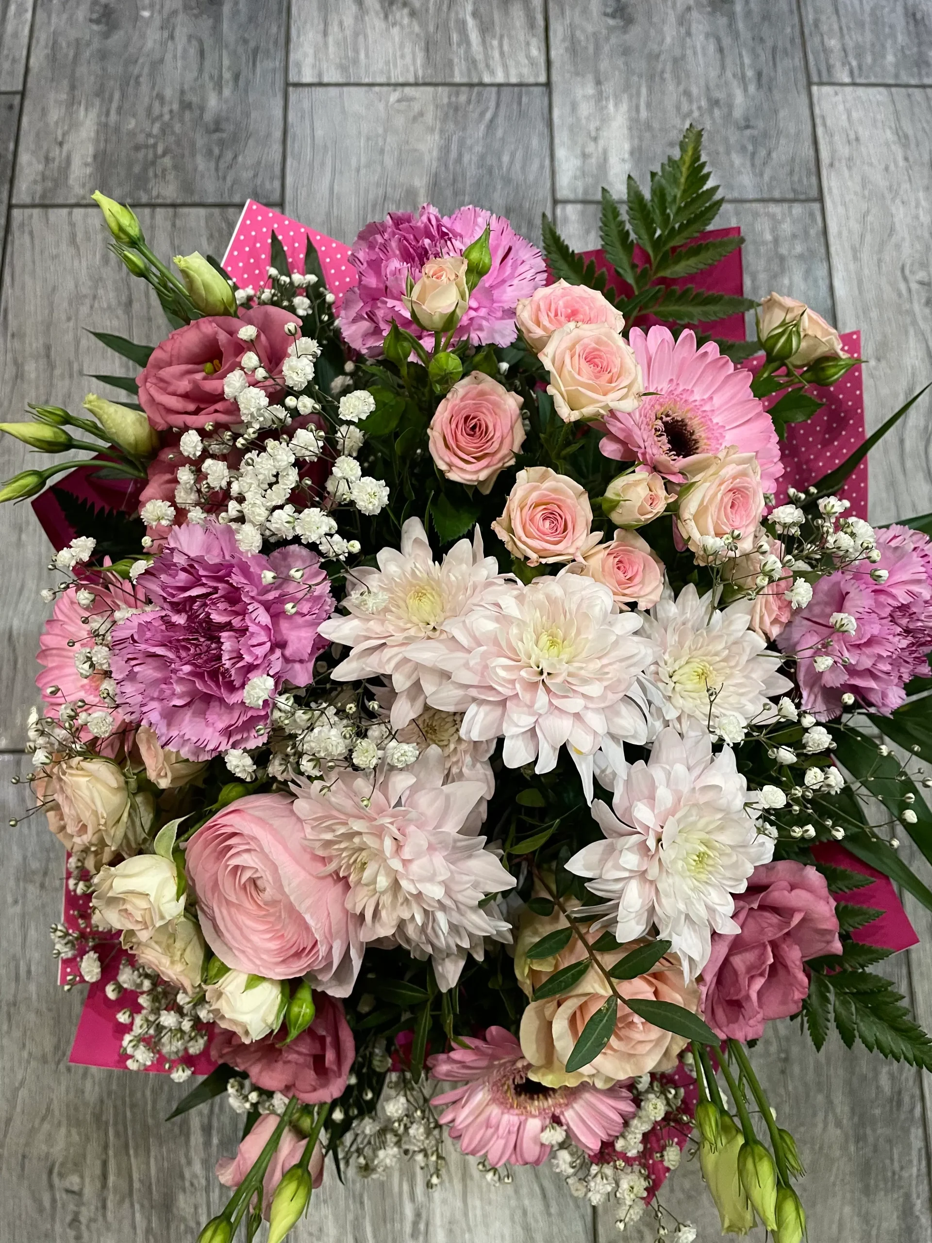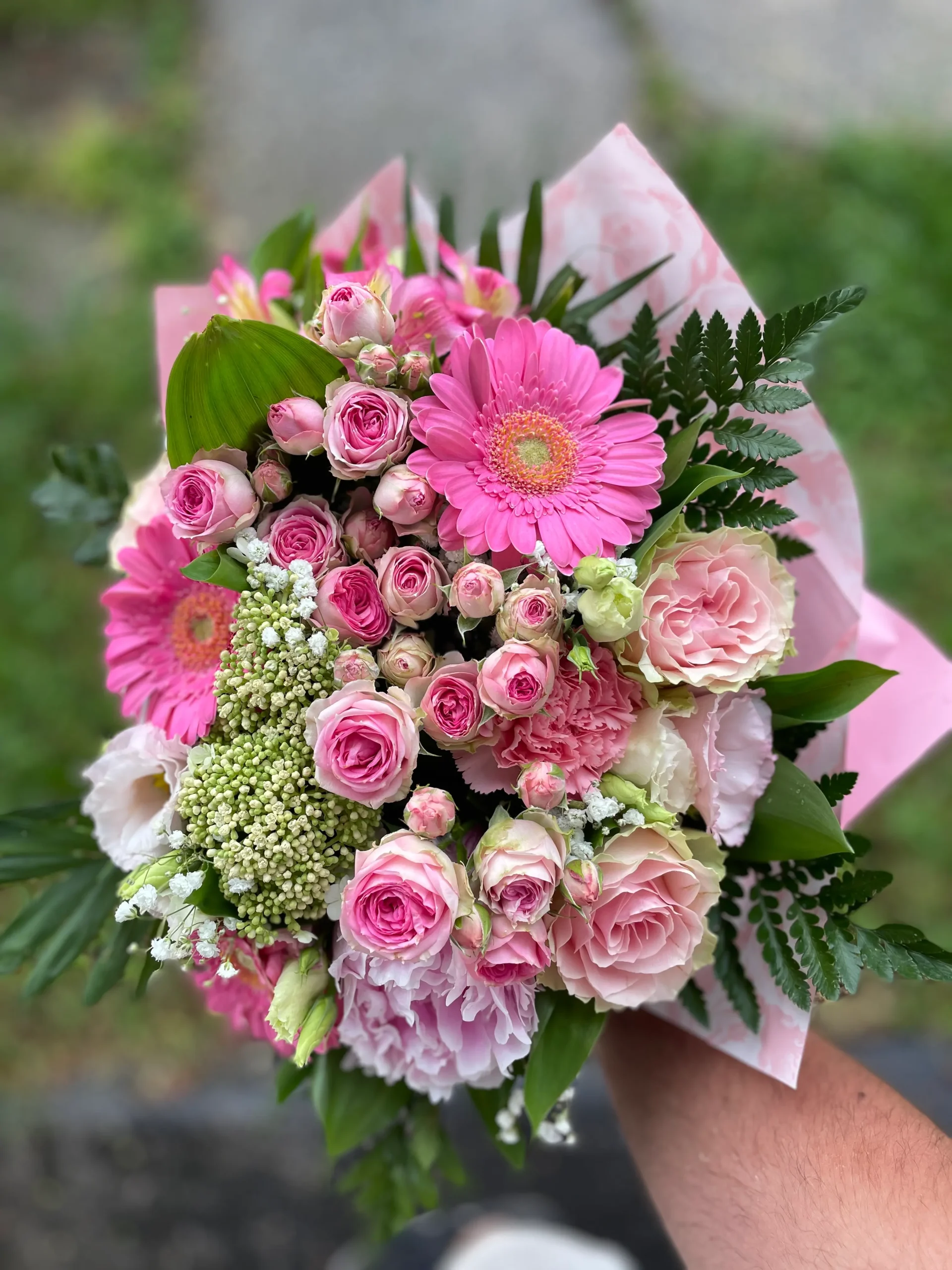 A Rózsaszín meglepetés csokor romantikus, lágy árnyalataival és bőséges virágkavalkádjával minden alkalmat ünnepivé varázsol. Igazán nőies ajándék, amely mindig mosolyt csal az arcokra. Kiváló választás bármilyen alkalomra!