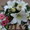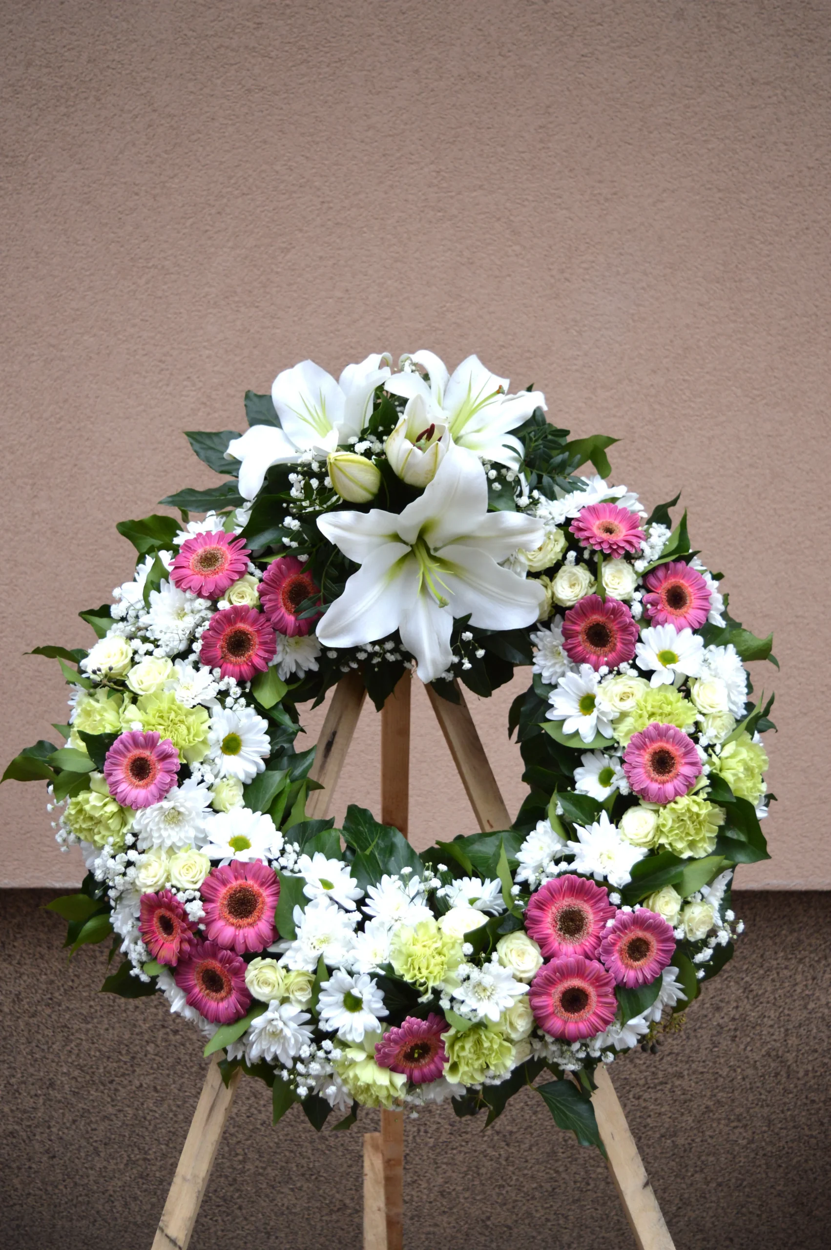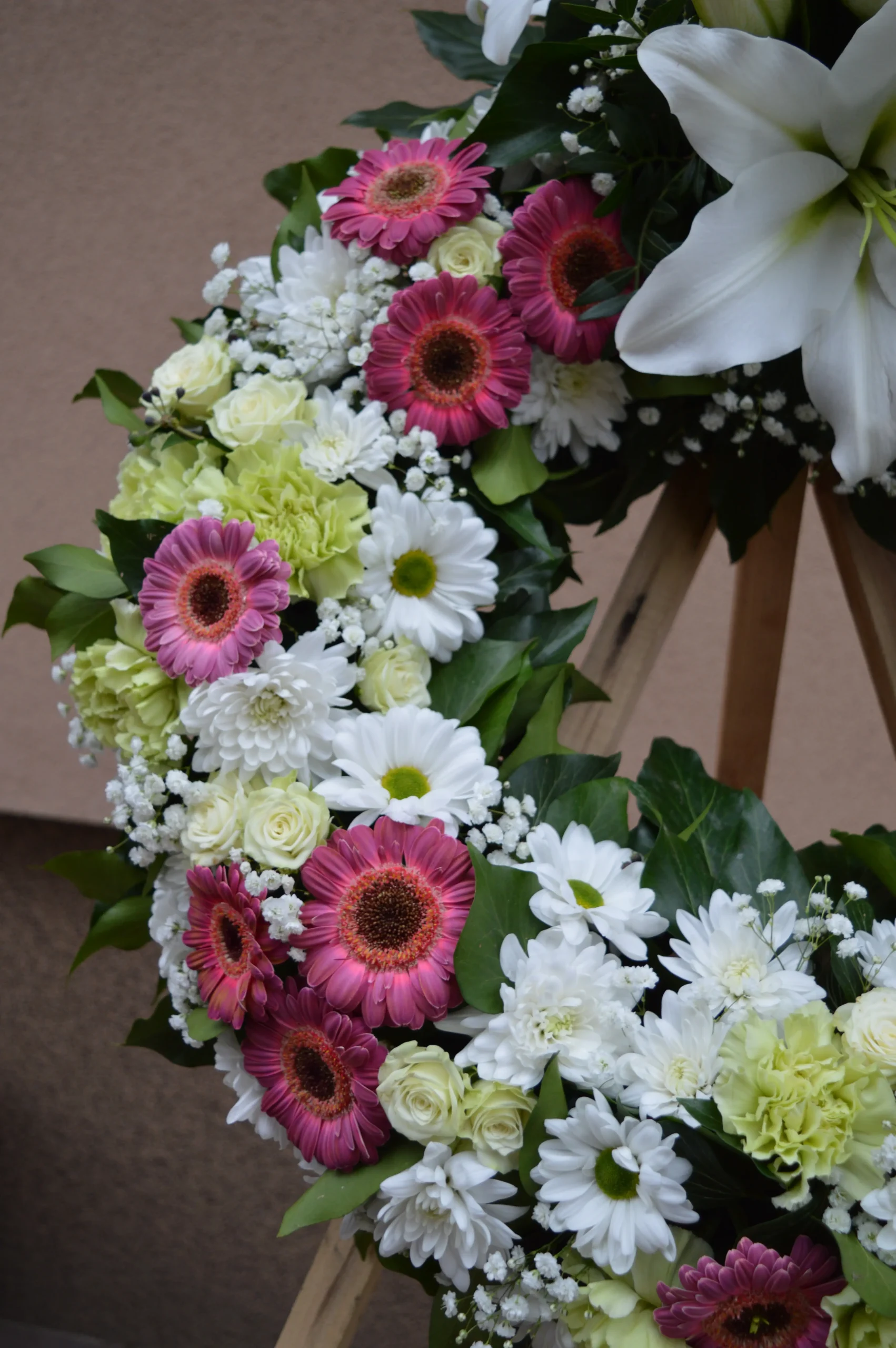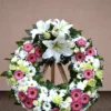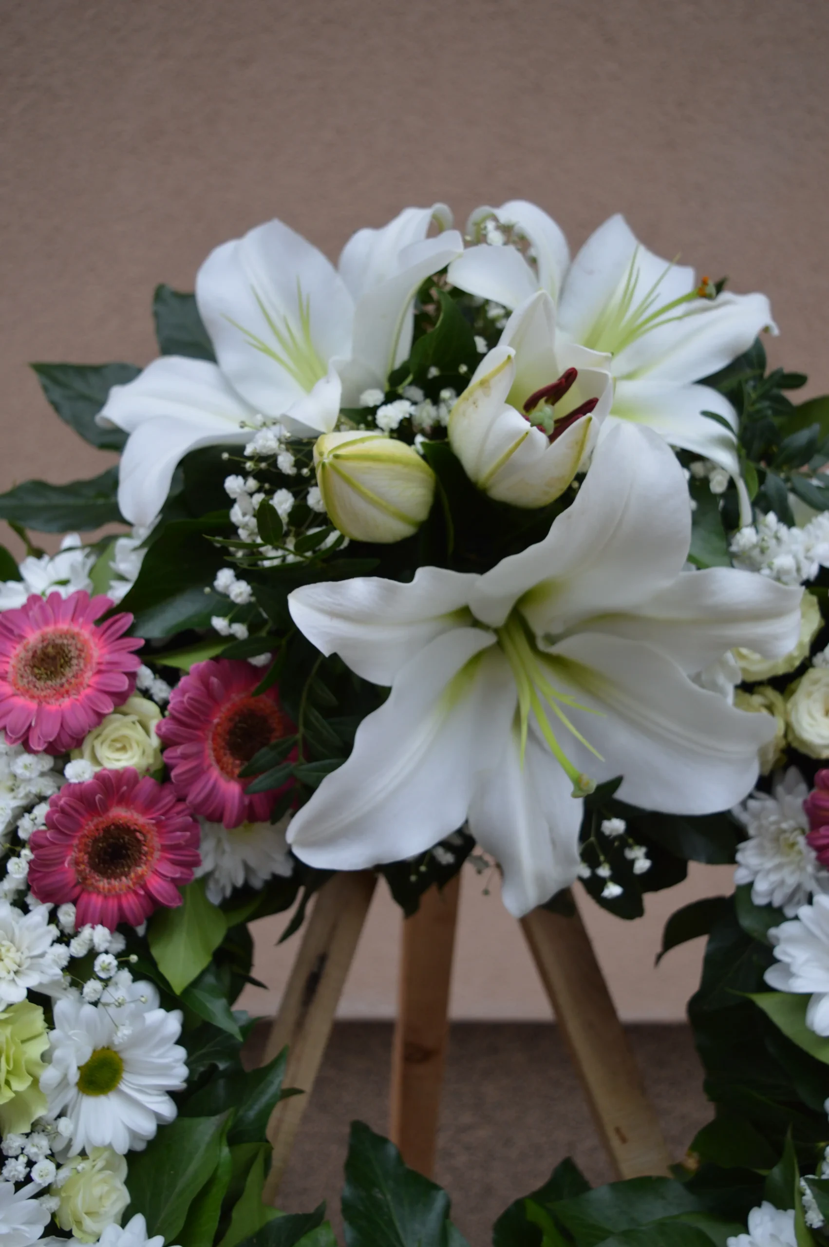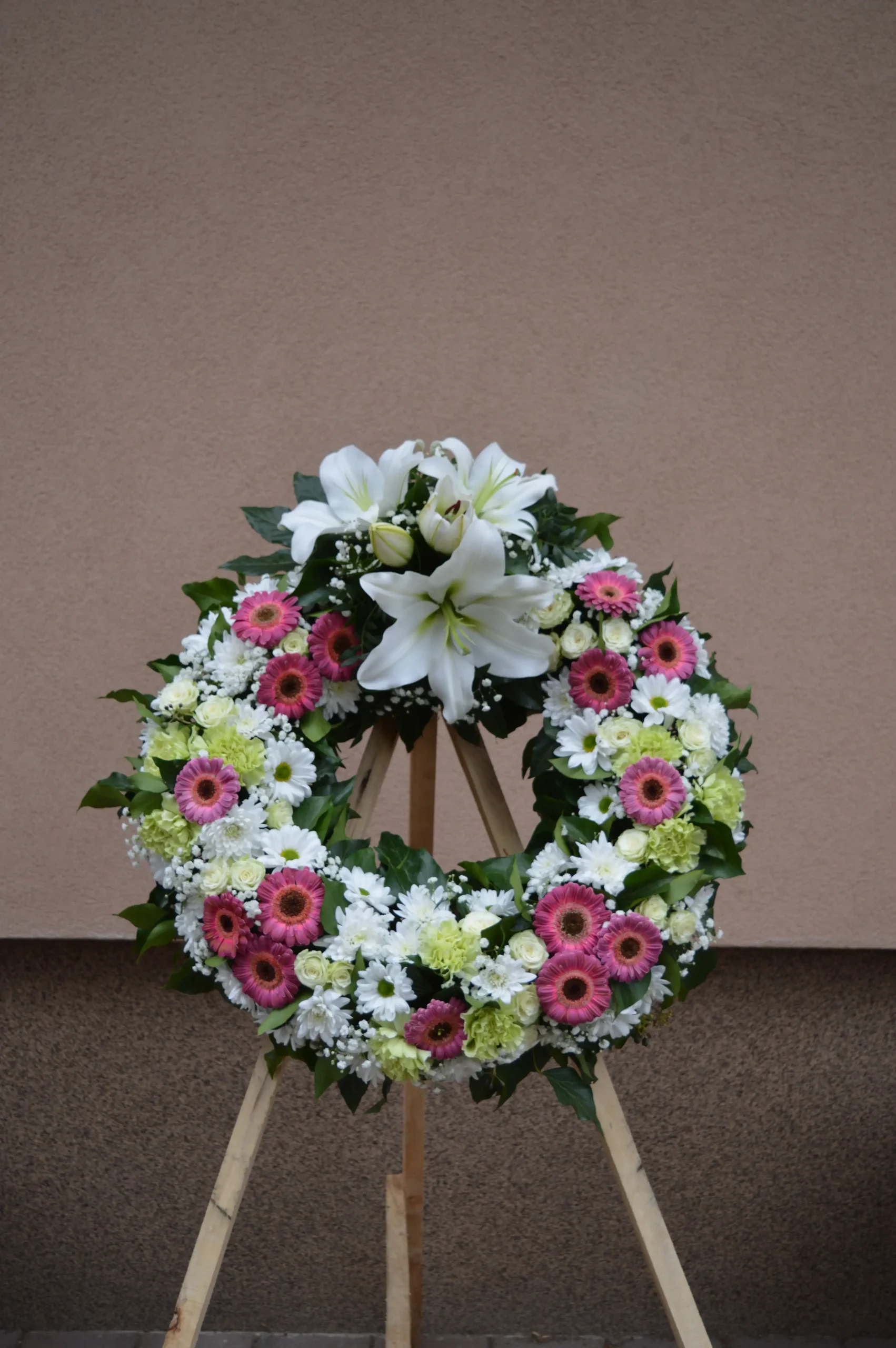 Mi ezt a színes temetési koszorút gondos odafigyeléssel, kézzel készítjük, hogy minden részlete harmóniát és nyugalmat sugározzon. A központi liliomok elegáns megjelenése csendes hangsúlyt ad a koszorúnak, miközben a körkörös forma az örökkévalóságot és az emlékezés folytonosságát szimbolizálja.