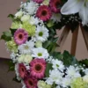 A Szelíd emlékezés színes temetési koszorú visszafogott színvilágával és harmonikus virágösszeállításával méltó módon fejezi ki az együttérzést és az őszinte búcsút. A fehér virágok a tisztaságot és a békét jelképezik, míg a lágy rózsaszín tónusok a szeretetre, az emlékek melegségére utalnak.