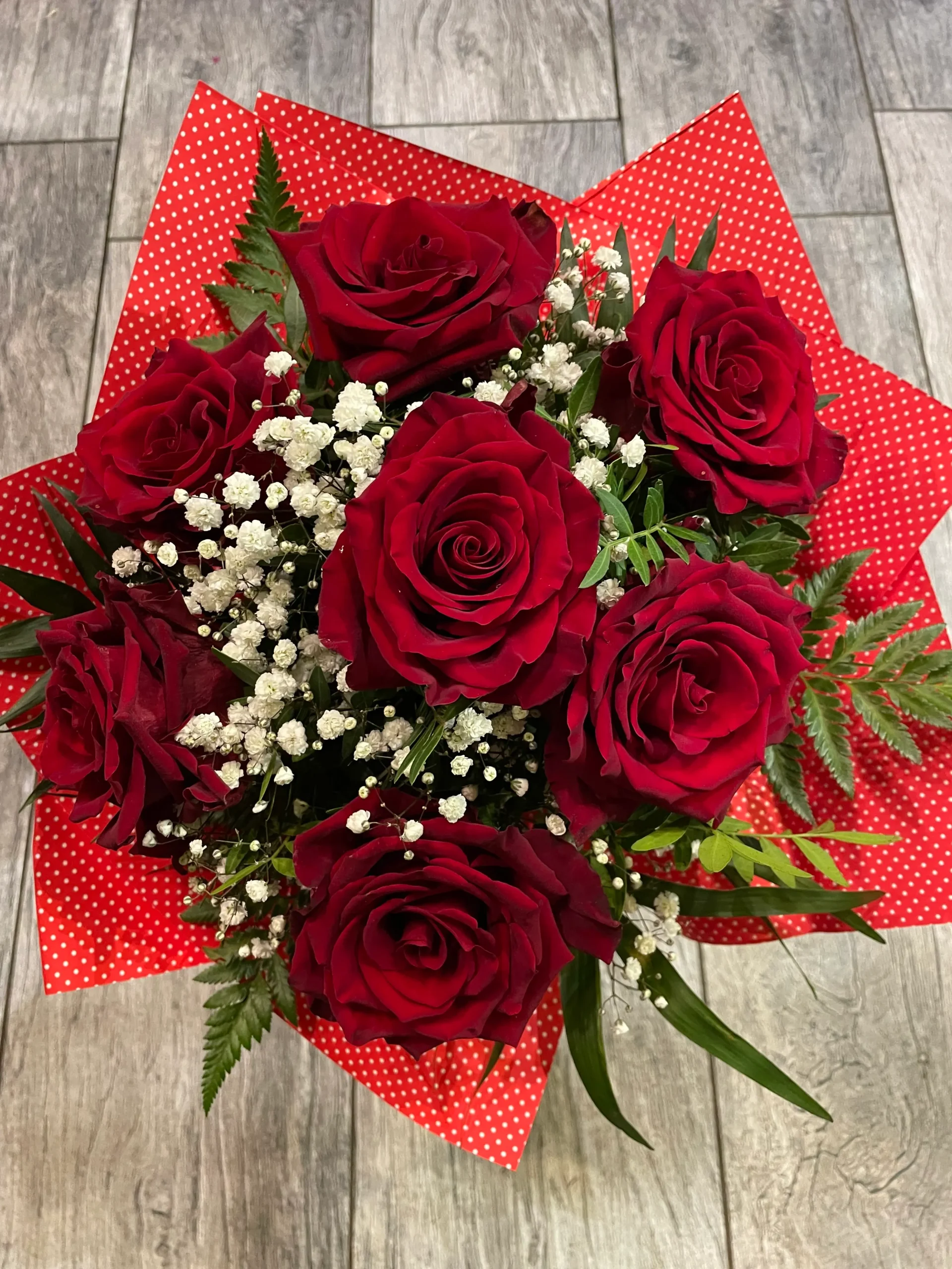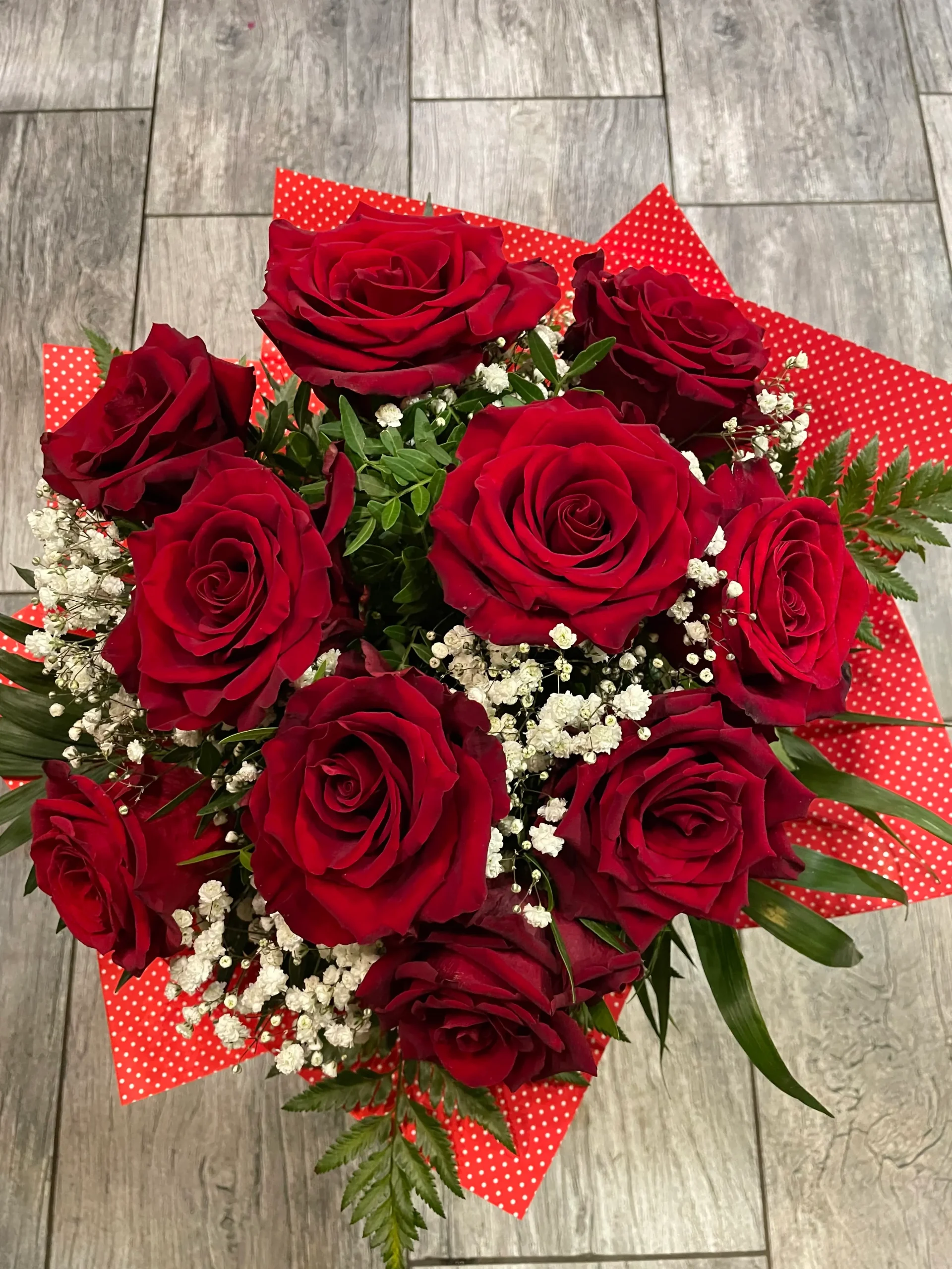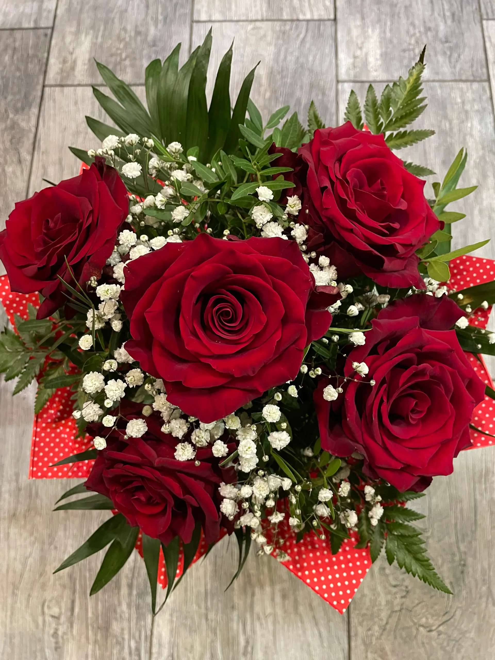 A képeken látható rózsacsokor mélybordó, bársonyos szirmú, extra minőségű rózsákat tartalmaz, melyeket apró, hófehér rezgő és zöld kiegészítő levelek tesznek még hangsúlyosabbá. A csokor hátterében a piros alapon pöttyös díszítőpapír vidám, mégis elegáns hangulatot áraszt, amely tökéletesen kiemeli a rózsák szépségét.