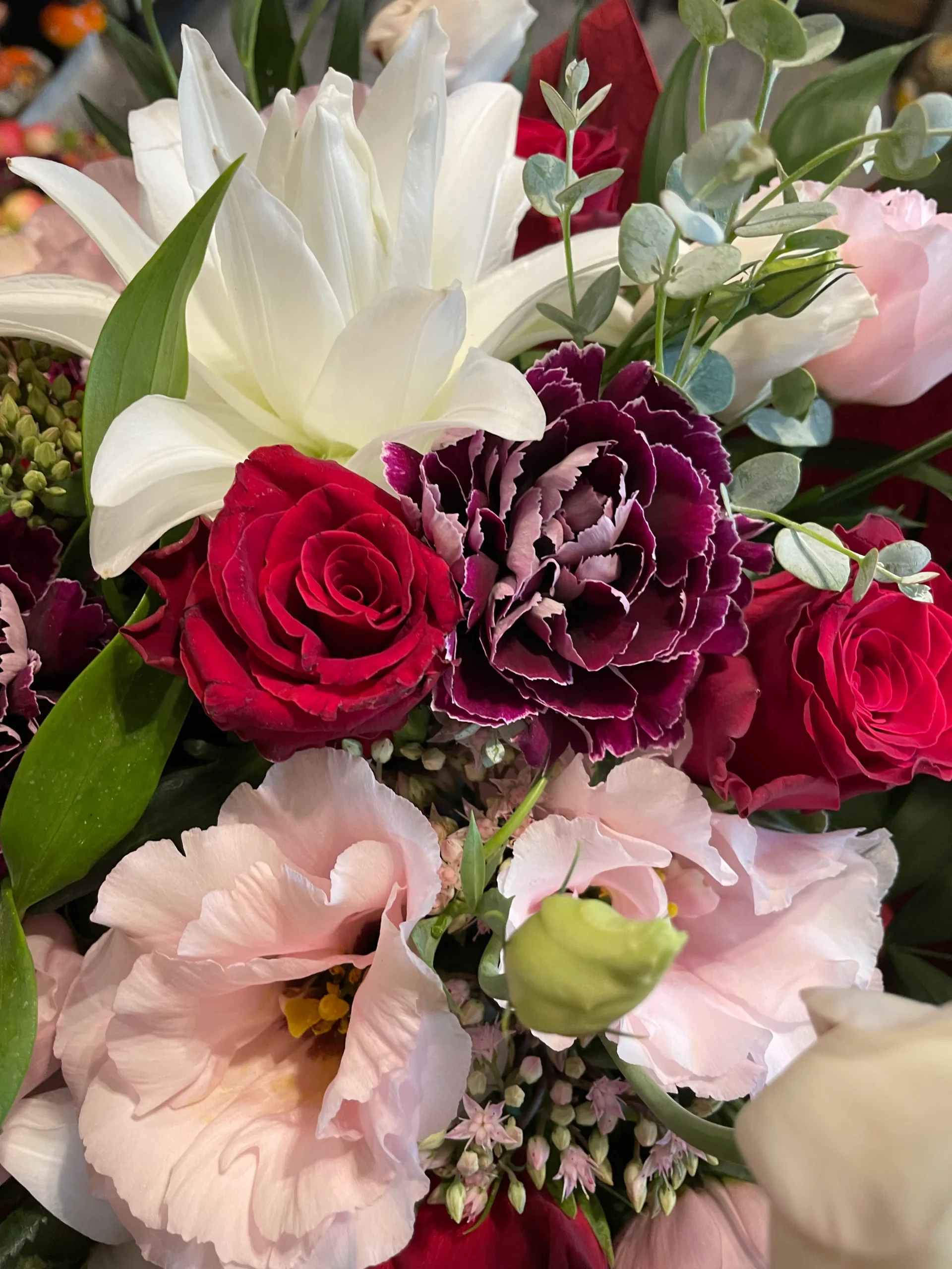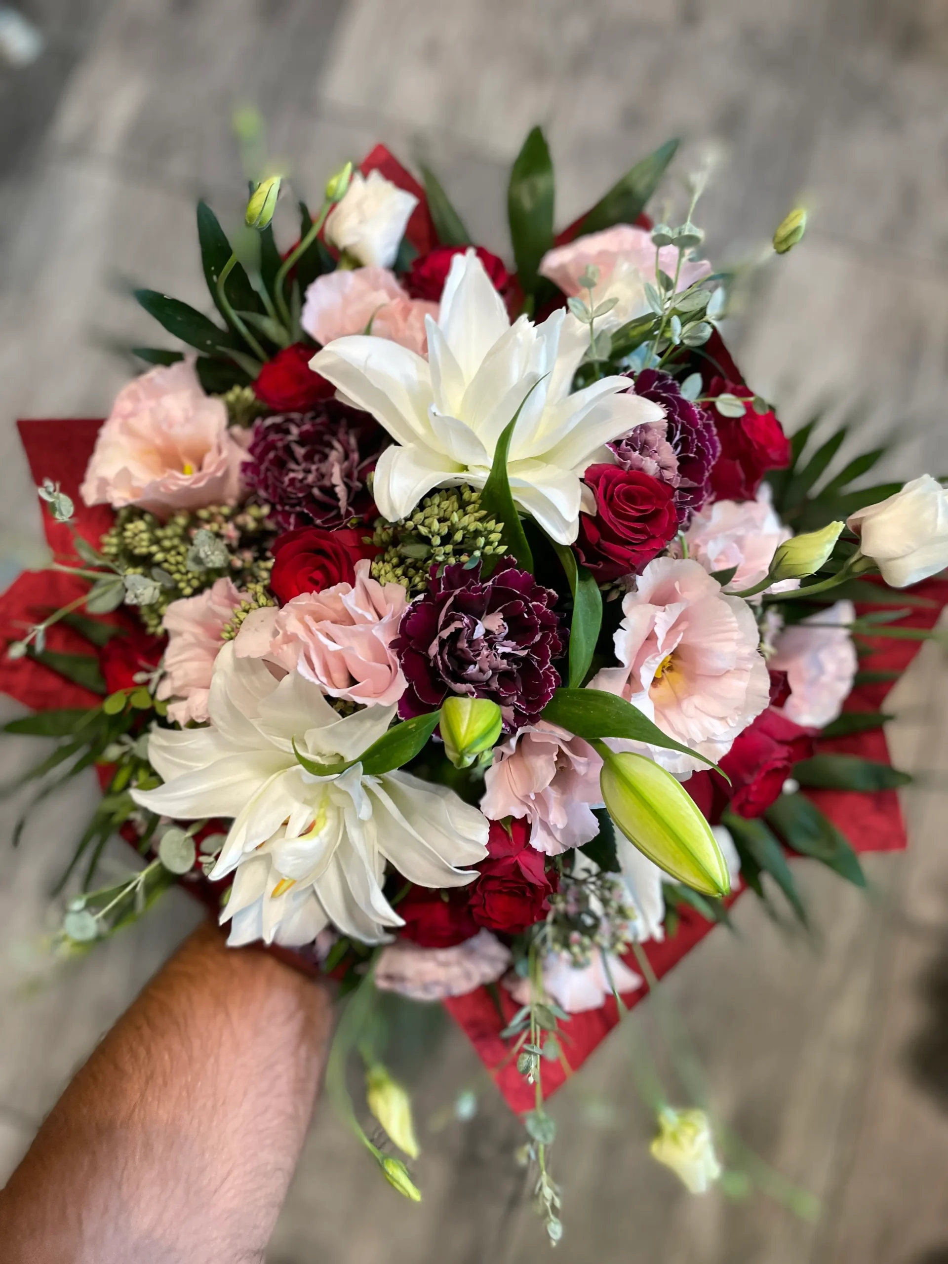 A üzletünkben minden virágcsokrot kézzel kötünk, gondosan válogatott, friss virágokból.