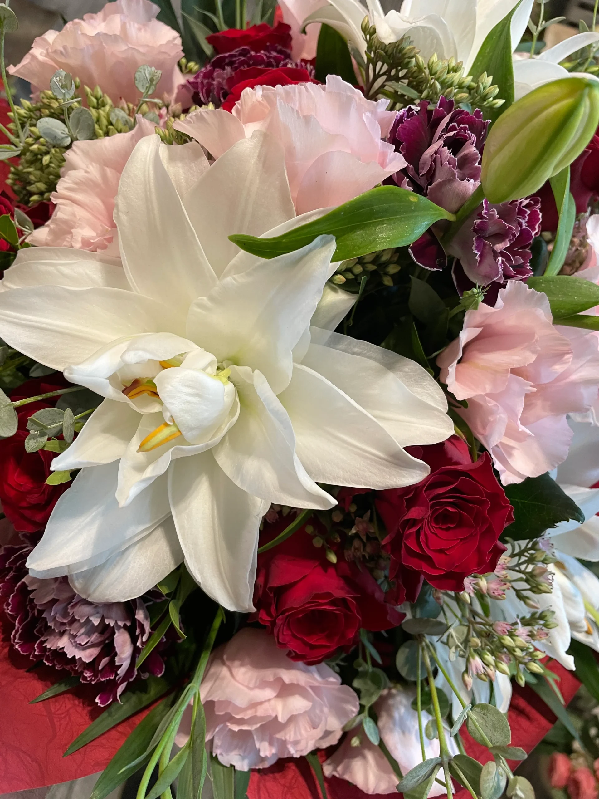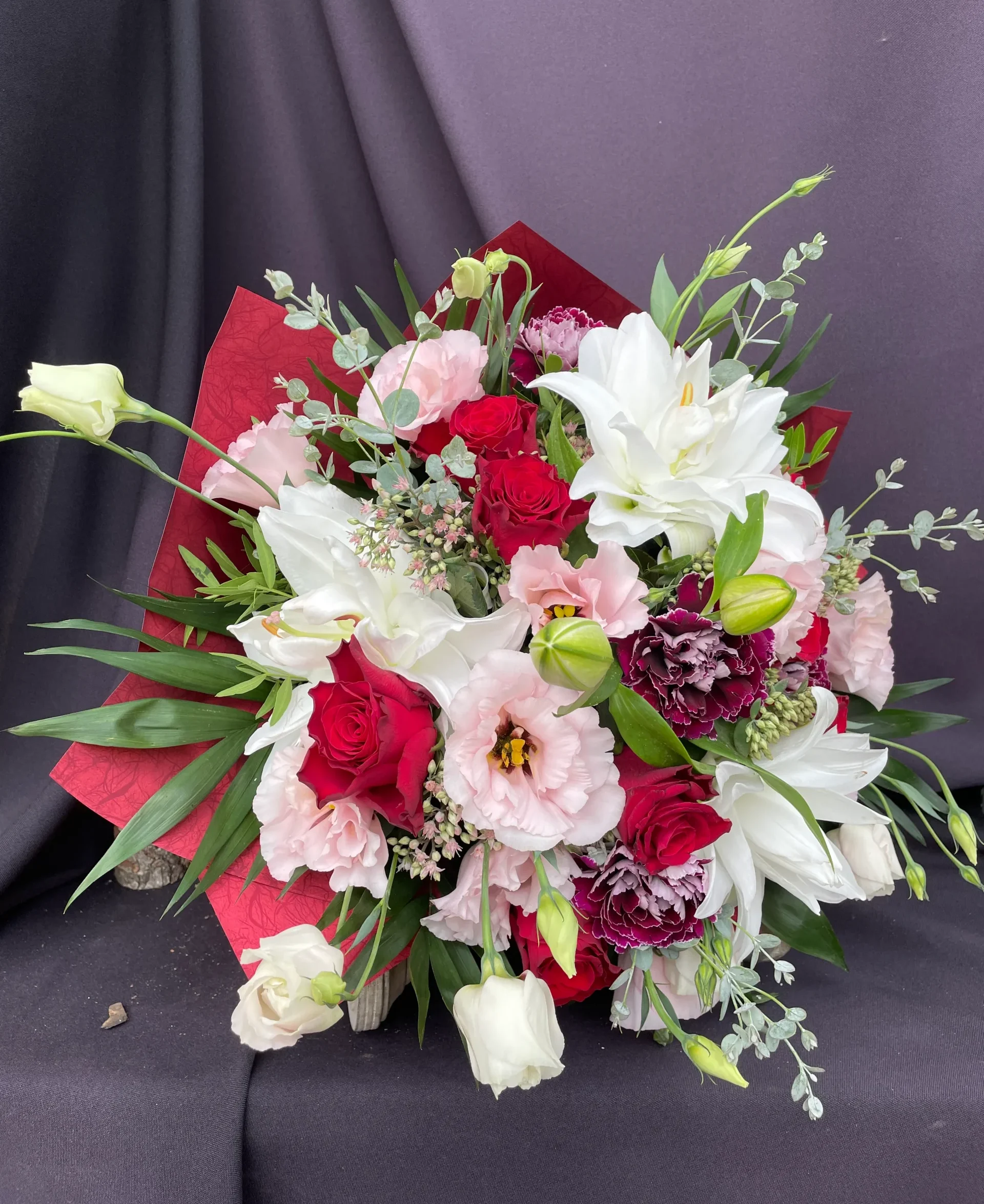 A piros és rózsaszín árnyalatok a szenvedélyt és a gyengédséget, míg a fehér liliom a tisztaságot és az eleganciát jelképezi.